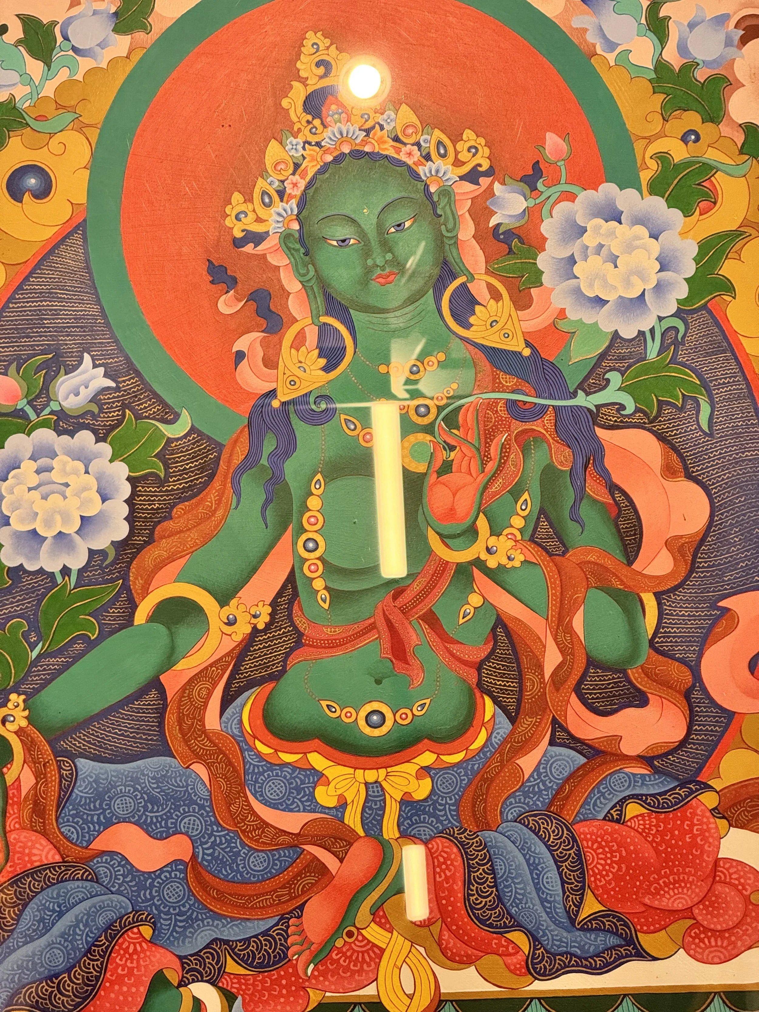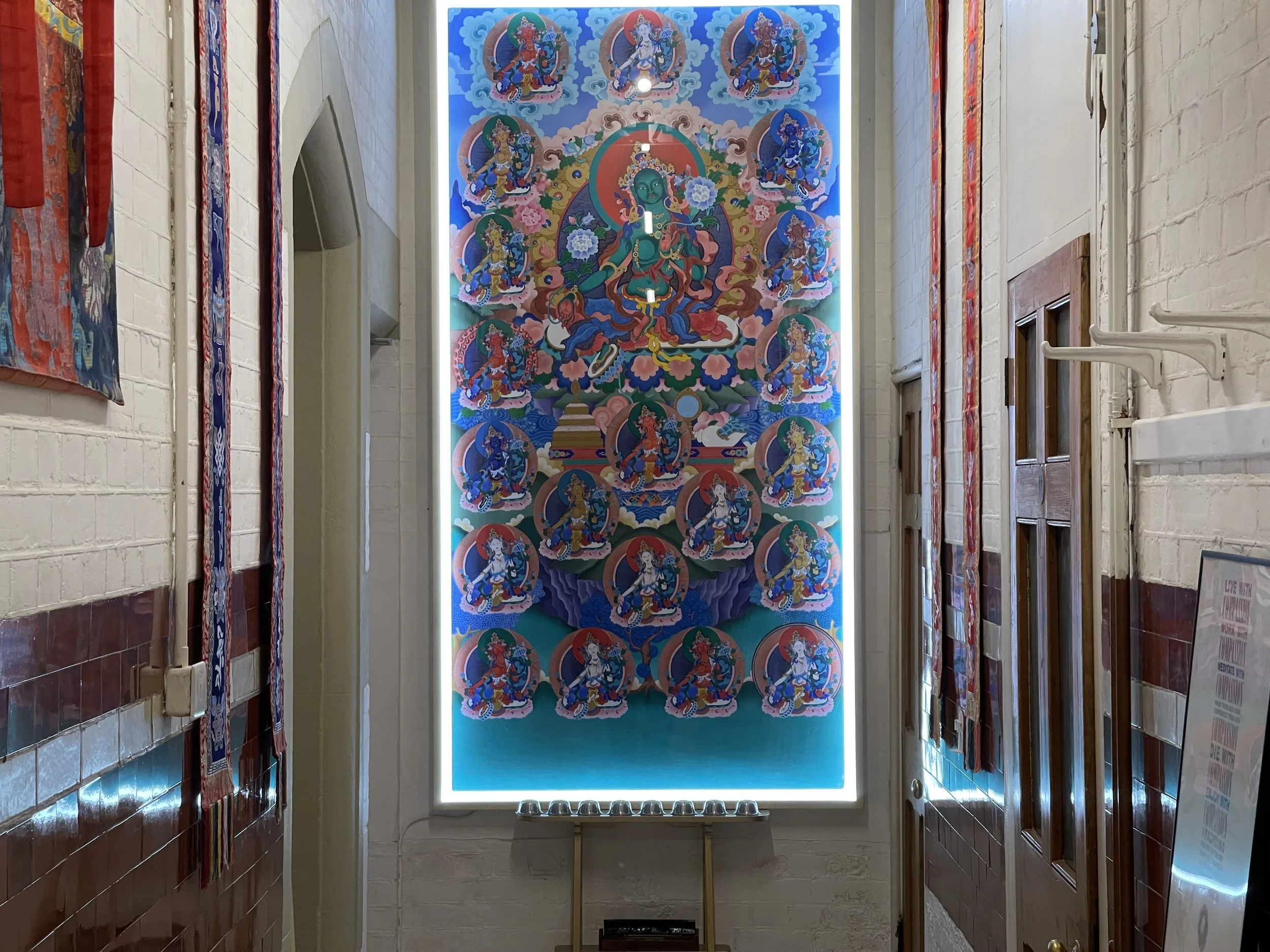 The first thing you see when entering the left wing of the Jamyang Buddhist Center in London is a majestic, well-illuminated painting of Green Tara surrounded by the 21 Taras. At least, those would be the terms one would apply to the image if one is already somewhat familiar with Himalayan Buddhist iconography; otherwise, it would most likely seem to simply be a dignified array of multi-colored goddesses (or fairies, maybe)—something that many people that I’ve spoken to seem to be attracted by regardless of their philosophical and contemplative background.